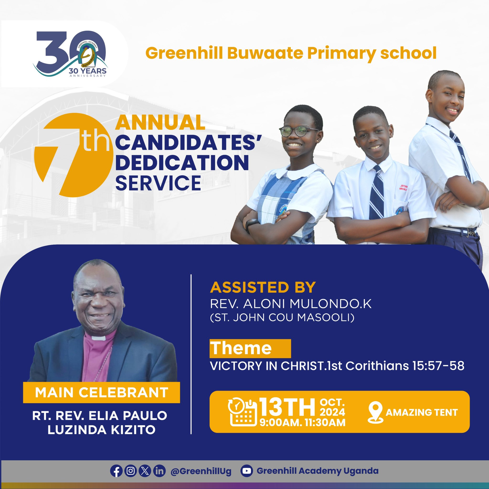 Parents, friends and well-wishers. You are invited to join us for 7th Annual Candidates’ Dedication Service at Greenhill Primary School, Buwaate this Sunday 13th-October.